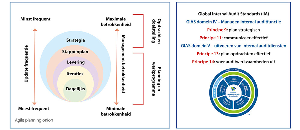 Agile planning bevordert flexibiliteit en responsiviteit in audits. De Agile Planning Onion (zie figuur 1) visualiseert zes lagen van planning en verbindt deze met relevante GIAS-standaarden.