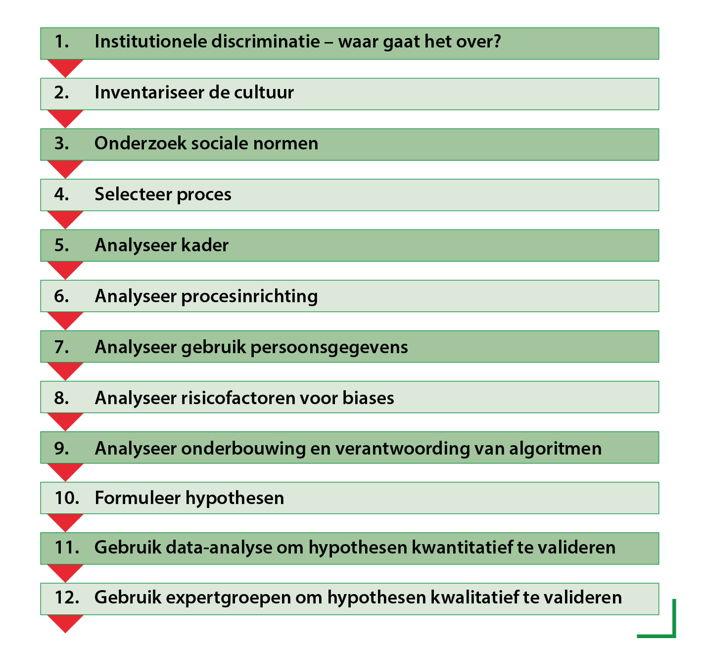 Het winnen van de Innovation Award heeft veel impact gehad. Deze reikt verder dan onze eigen organisatie. De publiciteit die het winnen van de Innovation Award opleverde, zorgde ervoor dat we de kans kregen het belang van het tegengaan van institutionele discriminatie breed onder de aandacht te brengen. Het is een onderwerp dat ons aan het hart gaat. Wij hebben zowel het IIA Congres als andere podia benut om dit onderwerp onder de aandacht te brengen bij andere auditafdelingen. En urgentie te creëren bij vakgenoten om het onderwerp op de agenda te zetten. Tegelijkertijd hebben we praktische handvatten gegeven om daar invulling aan te geven in de vorm van een stappenplan (zie figuur 1).